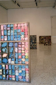 אוסף נשים מספר 1, שקיות ניילון מלופפות בחוטים בתוך מגירות דפוס של אותיות עבריות 2001