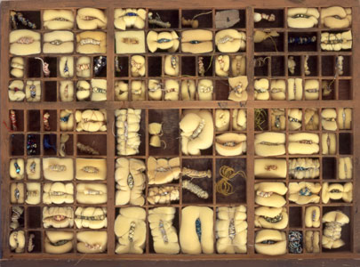 אוסף נשים מספר 5, מגירת דפוס של אותיות עבריות בתוכה ספוגים מלופפים בחוטים בצבעים שונים, 2001