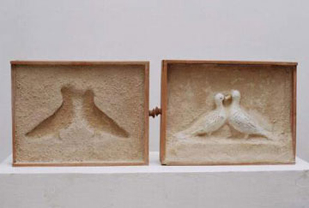 מקום לזוג יונים , אדמת גיר, פסלון גבס, שתי מגירות עץ, 1998